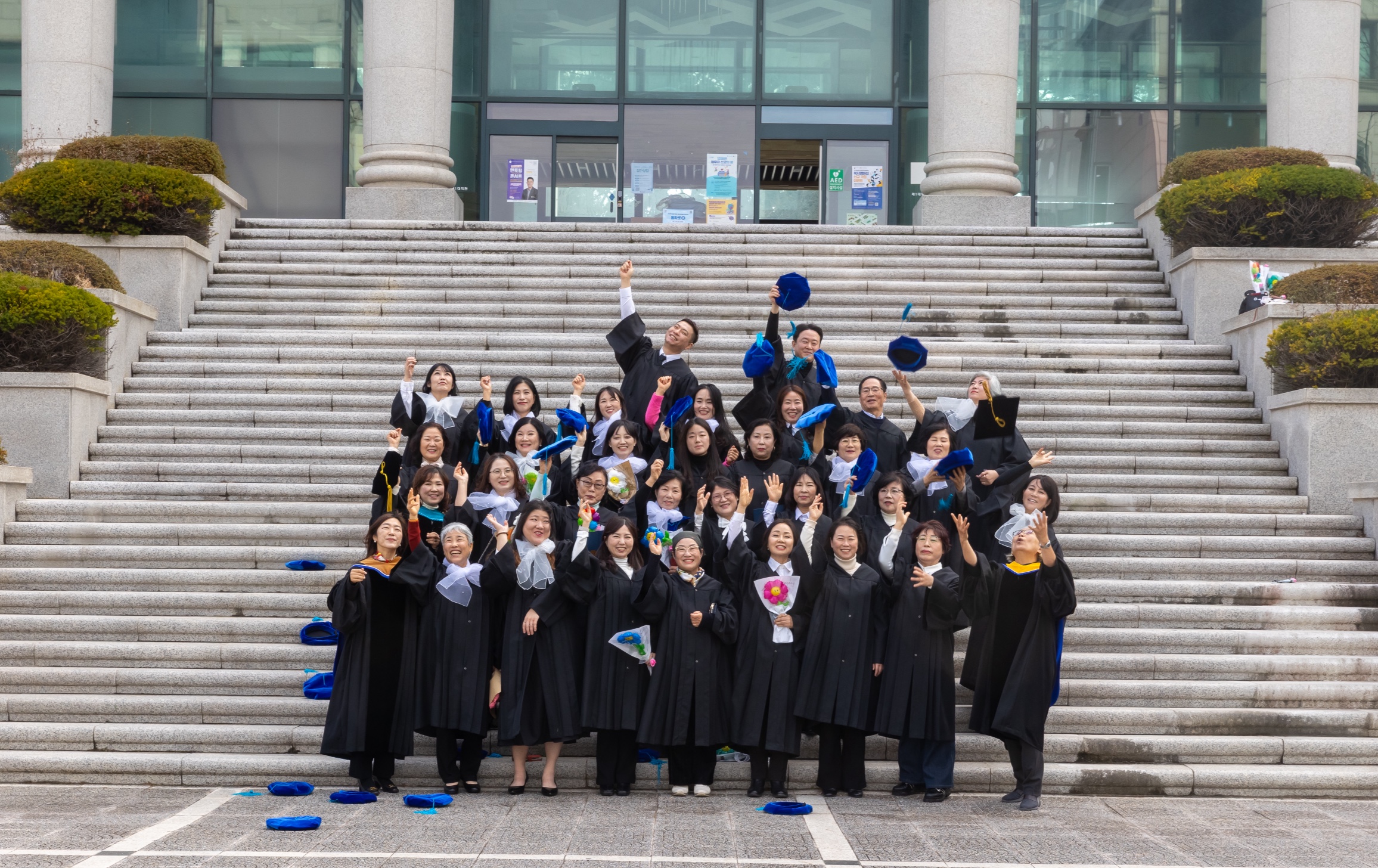 사진하면 빠질 수 없는 단체사진! 교수님들과 사회복지상담학과 학생분들이 모두 모여 대학교를 배경으로 다같이 단체사진을 찍었습니다~ 학사모도 날려주세요!